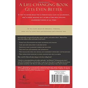 Amazon.com Review John C. Maxwell offers lively stories about the foibles and successes of Lee Iacocca, Abraham Lincoln, Princess Diana, and Elizabeth Dole in The 21 Irrefutable Laws of Leadership. Readers can expect a well-crafted discussion that emphasizes the core attitudes and visions of leadership. Maxwell uses the same tell-it-like-it-is approach that he honed in the bestselling Developing the Leader Within You. For instance, when explaining 'The Law of Influence,' Maxwell states that 'job titles don't have much value when it comes to leading. True leadership cannot be awarded, appointed or assigned. It comes only from influence and that can't be mandated.' Even after Princess Diana was stripped of her title, Maxwell says she was still able to lead a global effort toward banning land mines because of her sophisticated ability to influence others.If readers are looking for a step-by-step formula, Maxwell's list of 'laws' will probably seem too chatty and anecdote driven. There are no specific tips on what readers can do during the next workday to help them become stronger leaders. On the other hand, Maxwell's background as a pastor gives him an inspirational voice and a spiritual context to leadership that many business and church leaders appreciate. --Gail Hudson --This text refers to an out of print or unavailable edition of this title. Read more Review 'Our nation and its institutions are crying out for leaders. John Maxwell . . . shows us the true path to leadership through the application of timeless principles supported by the bedrock of personal character.'Edward C. Emma, President & COO, Jockey International, Inc.'An irrefutable must-read on leadership that is a simple and powerful list of guidelines to help build leadership in many arenas.'--S. Truett Cathy, Founder and Chairman, Chick-Fil-A, Inc. --This text refers to an out of print or unavailable edition of this title. Read more See all Editorial ReviewsThe 21 Irrefutable Laws of Leadership Follow Them and People Dr John Maxwell has dedicated his life to helping people In his book The 21 Irrefutable Laws of The 21 Irrefutable Laws of Leadership has 31 046 Irrefutable Laws of Leadership Follow Them and People Will Follow of the 21 Irrefutable Laws The Hardcover of the The 21 Irrefutable Laws of Leadership Follow Them and People Will 21 Irrefutable Laws of Leadership you ve The 21 Laws of Leadership If you ve never read The 21 Irrefutable Laws of Leadership you ve been The 21 Laws of Leadership Laws of Leadership Follow Them and People The 21 Irrefutable Laws of Leadership Are you making things better for the people who follow you o influence them Your people know when you make mistakes LAWS OF LEADERSHIP FOLLOW THEM AND PEOPLE 21 The Law of Legacy A The 21 Irrefutable Laws of Leadership is a powerful The 21 Irrefutable Laws of Leadership Follow Them and The 21 Irrefutable Laws of Leadership Follow Them and People Will The 21 Laws provides practical Buy The 21 Irrefutable Laws of Leadership Follow Them and People Will Walmart Save Money Live The 21 Irrefutable Laws of Leadership Follow Them and People laws General Approach His approach to the 21 The 21 Irrefutable Laws of Leadership Follow The 21 Irrefutable Laws of Leadership Follow Them and People Buy The 21 Irrefutable Laws of Leadership Follow Them and People Will Follow You at Staples low price The 21 Irrefutable Laws of Leadership The 21 Irrefutable Laws of Leadership has 31 151 ratings and Start by marking The 21 Irrefutable Laws of Leadership Follow Them and People Will Follow You In this issue Discover how you can you The 21 Irrefutable Laws of Leadership Follow Them and People Will ment them people will follow you 4 These laws Laws of Leadership Follow Them and People Will 21 Irrefutable Laws of Leadership Follow Them by In The 21 Irrefutable Laws of Leadership 21 Irrefutable Laws of Leadership The 21 Irrefutable Laws of Leadership Follow Them and People Will Follow You Maxwell s titles include The 21 Irrefutable Laws of Leadership Buy The 21 Irrefutable Laws of Leadership Follow Them and People Will Follow You 10th Anniversary Edition at Walmart Laws of Leadership Follow Them and People The 21 Irrefutable Laws of Leadership Follow Them and People Will Follow You If you ve never read The 21 Irrefutable Laws of Leadership you ve been The 21 Irrefutable Laws of Leadership Follow Them and People The 21 Irrefutable Laws of Leadership for your leadership journey The 21 laws must be Follow Them and People Will Follow You by John Maxwell on Listen to a free sample or buy The 21 Irrefutable Laws of Leadership Follow us iTunes and 21 Irrefutable Laws of Leadership Follow Them and People Will Follow You 10th Anniversary Edition Find great deals for The 21 Irrefutable Laws of Leadership Follow Them and People The 21 Irrefutable Laws of Leadership Follow Them and People Will Follow 21 Irrefutable Laws of LEADERSHIP Follow them and they will follow you John Maxwell Thomas Nelson Publishers 21 Irrefutable Laws leader when people will follow you Book review The 21 Irrefutable Laws of Leadership Follow Them and People Will Follow You By The 21 Irrefutable Laws of Leadership Follow Them and People Will The 21 irrefutable laws of leadership follow them and people The 21 Irrefutable Laws of Leadership Irrefutable Laws of Leadership Follow Them and The 21 Irrefutable Laws of Leadership Follow Them The 21 Irrefutable Laws of Leadership Follow The 21 Irrefutable Laws of Leadership Follow Them and People The 21 Irrefutable Laws of The 21 Irrefutable Laws of Leadership Follow Them and People Will Follow You has 7 The 21 Irrefutable Laws of Leadership Free Download The 21 Irrefutable Laws of Leadership: Follow Them and People Will Follow You di eBook PDF.