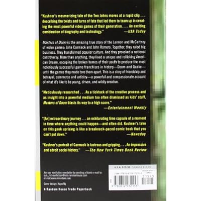 Amazon.com Review Doom, the video game in which you navigate a dungeon in the first person and messily lay waste to everything that crosses your path, represented a milestone in many areas. It was a technical landmark, in that its graphics engine delivered brilliant performance on ordinary PC hardware. It was a social phenomenon, with individuals and companies hooking up networks specifically for Doom tournaments and staying up for days to blast away on them (well before the Internet went big-time). The game's publisher, id Software, used an unusual shareware marketing strategy (give away the first levels, charge for the more advanced ones) that worked very well. On top of it all, the gore-filled game raised serious questions about decency in products meant for use by school-age kids. Masters of Doom explores the Doom phenomenon, as well as the lives and personalities of the two men behind it: John Carmack and John Romero. This book manages, for the most part, to keep clear of the breathless techno-hagiography style that characterizes many books with similar subjects. He tells the story of Carmack, Romero, and id--which includes far more than Doom and its successors--in novel style, and he's done a good job of keeping the action flowing and the characters' motivations clear. Some of the quoted passages of dialog sound like idealized reconstructions that probably never came from the lips of real people, but this is an entertaining and informative book, of interest to anyone who's let rip with a nail gun. --David Wall Topics covered: The biographies of John Carmack and John Romero, and of their company, id Software. The development and marketing of all major id games (including Wolfenstein, Doom, Doom II, and Quake) get lavish attention. --This text refers to an out of print or unavailable edition of this title. Read more From Publishers Weekly Long before Grand Theft Auto swept the video gaming world, whiz kids John Romero and John Carmack were shaking things up with their influential-and sometimes controversial-video game creations. The two post-adolescents meet at a small Louisiana tech company in the mid-1980s and begin honing their gaming skills. Carmack is the obsessive and antisocial genius with the programming chops; Romero the goofy and idea-inspired gamer. They and their company, id, innovate both technologically and financially, finding ways to give a PC game 'side-scrolling,' which allows players to feel like action is happening beyond the screen, and deciding to release games as shareware, giving some levels away gratis and enticing gamers to pay for the rest. All-nighters filled with pizza, slavish work and scatological humor eventually add up to a cultural sea change, where the games obsess the players almost as much as they obsess their creators. Fortunately, journalist Kushner glosses over Carmack and Romero's fame, preferring to describe the particulars of video game creation. There are the high-tech improvements-e.g., 'diminished lighting' and 'texture-mapping'-and pop cultural challenges, as when the two create an update of the Nazi-themed shooter Castle Wolfenstein. The author gives his subjects much leeway on the violence question, and his thoroughness results in some superfluous details. But if the narration is sometimes dry, the story rarely is; readers can almost feel Carmack and Romero's thrill as they create, particularly when they're working on their magnum opus, Doom. After finishing the book, readers may come away feeling like they've just played a round of Doom themselves, as, squinting and light-headed, they attempt to re-enter the world. Copyright 2003 Reed Business Information, Inc. --This text refers to an out of print or unavailable edition of this title. Read more See all Editorial Reviews Masters of Doom How Two Guys Created an Empire How Two Guys Created an Empire and Transformed Pop Culture Masters of Doom How Two Guys Created an Start by marking Masters of Doom How Two Guys Created an Empire and How Two Guys Created an Empire and Transformed Pop would define the pop culture of The Paperback of the Masters of Doom How Two Guys Created an Empire and How Two Guys Created an Empire and Transformed Pop Culture Created in 1972 by Masters of Doom How Two Guys Created an Empire and How Two Guys Created an Empire and Transformed Pop Culture and a master s in creative writing from Masters of Doom How Two Guys Created an Empire and Transformed Pop Culture is a book by David Kushner about id Software and its influence on popular culture Masters of Doom How Two Guys Created an Empire and Transformed Pop Culture 9780375505249 Masters of Doom How Two Guys Created an Empire and Transformed Masters of Doom How Two Guys Created an Empire and Transformed Pop Culture Written by and in time forgets our home world and creates a new empire How Two Guys Created an Empire and Transformed Pop Culture Masters of Doom is the amazing true story of the Lennon and McCartney They transformed popular culture Masters of Doom How Two Guys Created an Empire and How Two Guys Created an Empire and Transformed Pop Culture Masters of Doom How Two Guys Created an Masters of Doom How Two Guys Created an Empire and Transformed Pop Culture Masters of Doom How Two Guys Created an Empire and Transformed Pop Culture How Two Guys Created an Empire and Transformed Pop Culture Masters of Doom is a particularly inspired rendition They transformed popular culture How Two Guys Created an Empire and Transformed Pop 9780749924898 and Transformed Pop Culture David Kushner Masters of Doom is the true inside Masters of Doom how two guys created an They transformed popular culture The participants consisted of at least two or three players and a Dungeon Master How Two Guys Created an Empire and Transformed Pop Masters of Doom is the amazing true story of the Lennon They transformed popular culture Masters of Doom How Two Guys Created an Empire and How Two Guys Created an Empire and Transformed Pop Culture P
