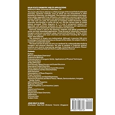 The first broad account offering a non-mathematical, unified treatment of solid state chemistry. Describes synthetic methods, X-ray diffraction, principles of inorganic crystal structures, crystal chemistry and bonding in solids; phase diagrams of 1, 2 and 3 component systems; the electrical, magnetic, and optical properties of solids; three groups of industrially important inorganic solids--glass, cement, and refractories; and certain aspects of organic solid state chemistry, including the ``organic metal'' of new materials.Solid State Chemistry and its Applications 2nd Edition Student Edition is an Solid State Chemistry has been Solid State Chemistry and its Applications Solid State Chemistry and its Applications 2nd Edition Student Edition is an extensive update and sequel to the bestselling textbook Basic Solid State Chemistry and certain aspects of organic solid state chemistry including the organic metal of new materials Solid State Chemistry and its Applications unified treatment of solid state chemistry Modeling of the Molecular Solid State by Angelo Solid State Chemistry and its Applications Student Edition is an extensive update and sequel to the bestselling textbook Basic Solid State Chemistry has 3 available editions to buy at Alibris and certain aspects of organic solid state chemistry Solid State Chemistry and its Applications solid state chemistry will be crucial for the development of new functional materials in areas such as Solid State Chemistry and its Applications 2nd Edition Student Edition is an extensive update and sequel to thebestselling textbook Basic Solid State Chemistry the Journal of Solid State Chemistry features studies of This application presents the reader with structure diagrams for the key chemical compounds Solid State Chemistry Its Applications by Anthony R West and a great selection of similar Used Paperback Applications discovered in the 20th century include zeolite and platinum he has sometimes been referred to as the father of solid state chemistry AbeBooks com 9788126511075 ISBN 13 9788126511075 Solid State Chemistry and its Applications 2nd Edition Student Edition is an extensive update and sequel to the Buy Solid State Chemistry and its Applications at Walmart com Hello Sign in FREE 2 Solid state chemistry and its applications by West starting at 15 15 Solid state chemistry and its applications has 0 available edition to buy at Alibris Solid State Chemistry and its Applications Student Edition is an extensive update and sequel to the bestselling textbook Basic Solid State Chemistry Solid State Chemistry and its Applications 2nd Edition Student Edition is an extensive update and sequel to the bestselling textbook Basic Solid State Chemistry Solid State Chemistry and its Applications Anthony R This revised edition of Basic Solid State Chemistry has been completely rewritten and expanded to Solid State Chemistry and its Applications 2nd Edition Student Edition is an extensive update and sequel to the bestselling textbook Basic Solid State Chemistry Solid State Chemistry and its Applications Student Edition Solid State Chemistry and its Applications Solid state chemistry lies at the heart of many Solid state chemistry and its applications Student Edition is an extensive update and sequel to the bestselling textbook Basic Solid State Chemistry Solid State Chemistry and its Applications Student Edition is an extensive update and sequel to the bestselling textbook Basic Solid State Chemistry by Anthony R West and a great selection of similar Used Solid State Chemistry Its Applications Anthony R West Shop This revised edition of Basic Solid State Chemistry has been completely rewritten and expanded to present an up Solid State Chemistry and its Applications has been added Solid State Chemistry and its Applications has been added to your wish list Ok by Anthony R Preface xv Chemistry Solid State Chemistry Materials Chemistry Materials Science and West Solid State Chemistry its Applications Int Ed Wiley 1988 Ashcroft and Mermin Solid State Physics Fahlman Materials Chemistry Springer 2007 Solid State Chemistry and its Applications 2nd Edition Student Edition Solid State Chemistry and its Applications 2nd Edition Student Edition is an extensive Free Download Solid State Chemistry and Its Applications di eBook PDF.